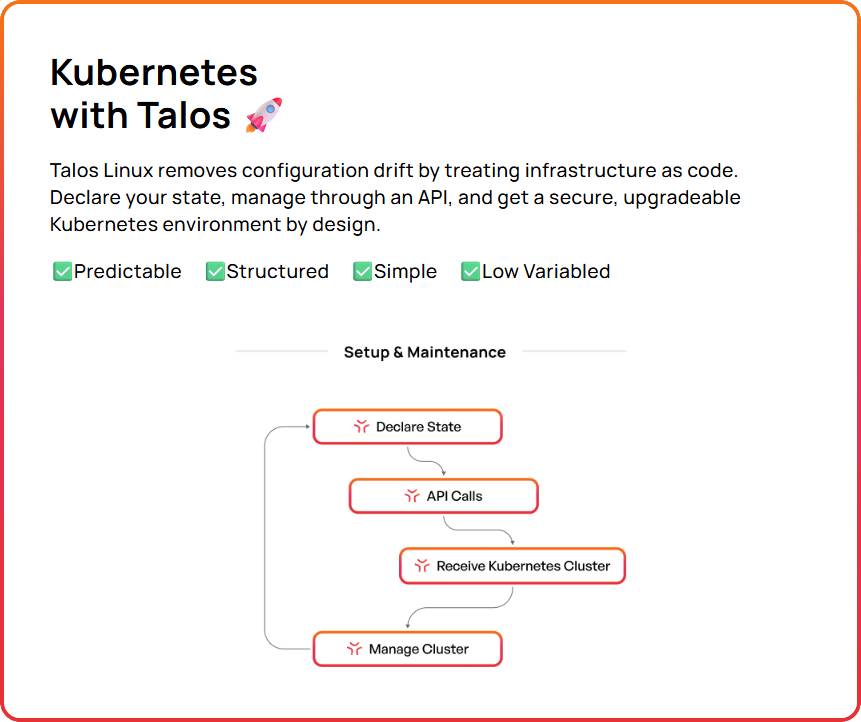 SteelDome ships Talos Linux as a first-class node OS inside StratiSYSTEM OS. Your platform team can provision reproducible, policy-driven Kubernetes on VMs or bare metal using an immutable, API-managed operating system—ideal for GitOps and fleet operations.
